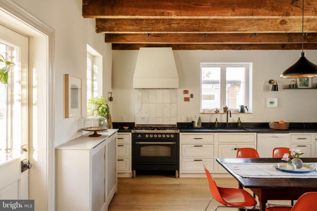 Perfectly positioned between Germantown Avenue and Pastorius Park — just one block in either direction — this restored Chestnut Hill home offers walkability to shops and restaurants, everyday access to green space, easy reach of the Wissahickon trails, and the added flexibility of a detached studio tucked just beyond the courtyard. A stone single with a distinctive mansard roof, the home has been thoughtfully reworked with a clear design sensibility and consistent material choices throughout. Exposed rafters, deep-set windows, and layered materials give the home texture and warmth, while modern upgrades — updated systems, central air, and a reimagined kitchen and baths — support comfortable daily living. You enter into the front parlor: floor-to-ceiling built-in shelving, a window seat, white oak floors that run through the entire first floor. Next is the bright, comfortable living room with a stylish ceiling fan and original millwork. Basement access is from this room. Through to the heart of the home — the kitchen: heavy timber beams overhead, soapstone counters, a professional-style range beneath a custom vent hood, structural floating shelves, and a dining area anchored by botanical wallpaper. A room that works as hard as it looks good. A side door connects directly to the driveway. Throughout the home, lighting, paint choices, and built-ins added by the current owners reflect an intentional and cohesive approach to design. Four bedrooms and two full baths span three levels, with every nook considered. The second-floor bath: freestanding soaking tub, zero-entry shower, heated marble floors, heated towel bars, matte black fixtures. The third-floor bath: a jack-and-jill between two bedrooms with a deep green tile shower and live-edge wood vanity shelf. The basement provides additional storage, laundry, and a powder room for everyday convenience. Outside, a courtyard sits beneath a pergola that fills with Concord grape vines each summer — enjoyed as an outdoor dining and lounge area with the feel of a tucked-away European courtyard. Off-street parking for two cars adds everyday practicality. Just beyond the courtyard sits a former three-car garage, now an approximately 500-square-foot artist's studio with additional storage. Filled with natural light and equipped with its own mini-split heating and cooling system, it offers a rare layer of flexibility — studio, office, workshop, fitness space, guest overflow. Set in the heart of Chestnut Hill, this is a home with a point of view — positioned for buyers who recognize what they're looking at.